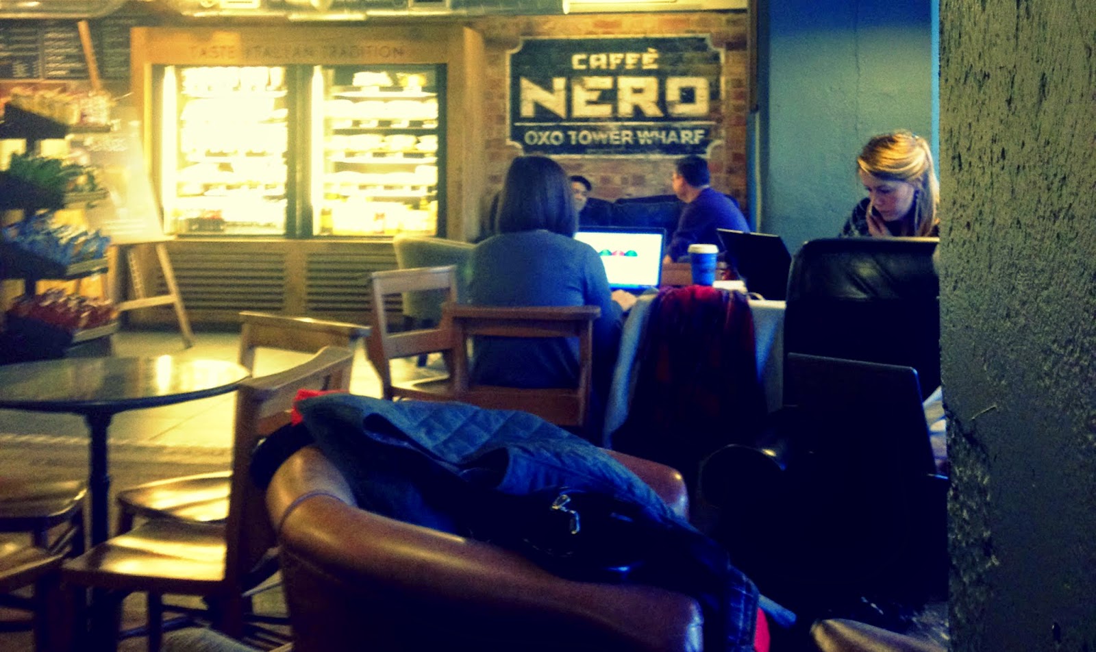 O 10.00 zmarzłyśmy już trochę i zrobiłyśmy sobie przerwę na gorącą czekoladę w Caffe Nero w Oxo Tower. O tej porze grała tam przyjemnie muzyka klasyczna.
