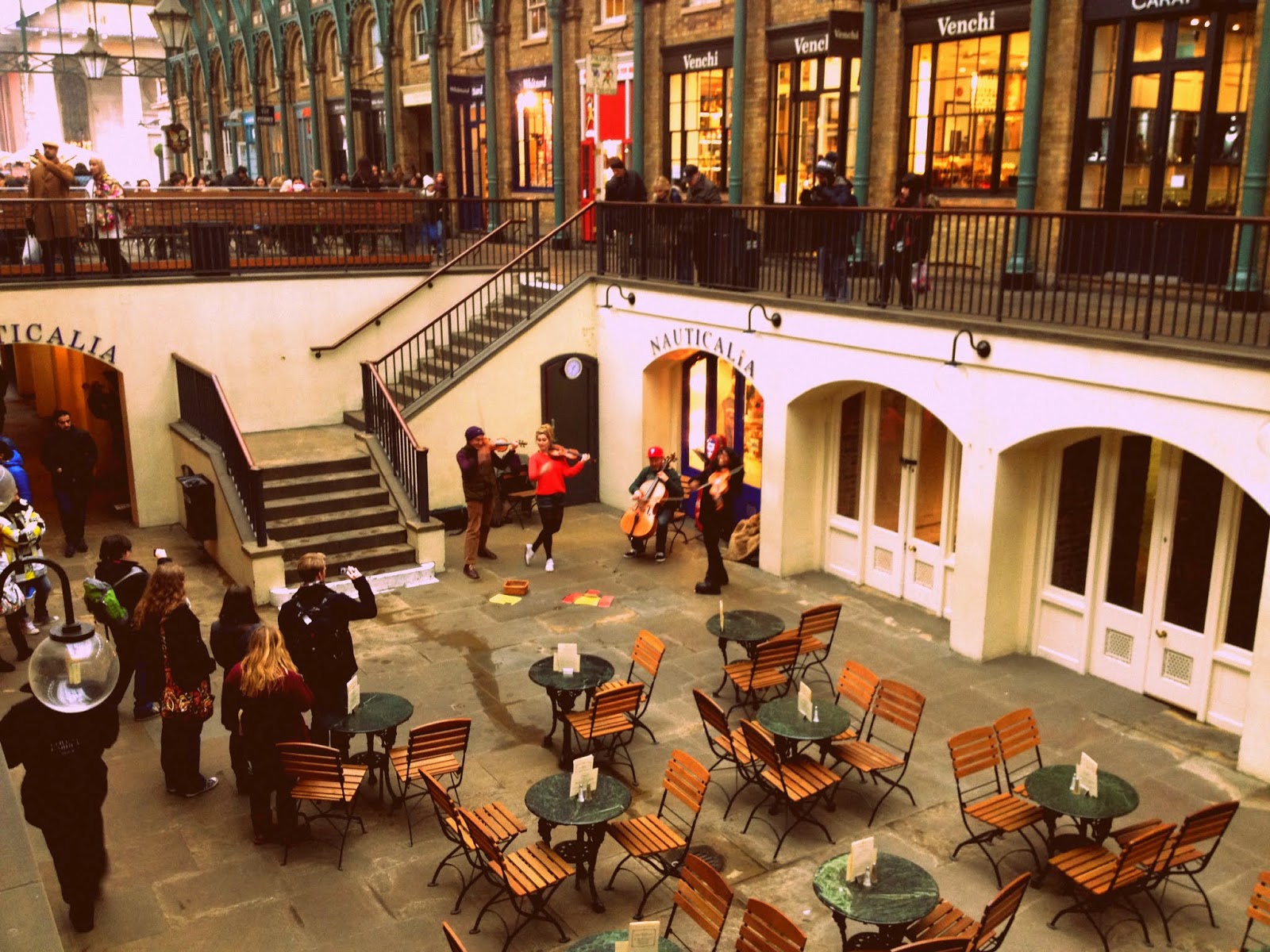 Kilka ulic dalej i znaleźliśmy się w Covent Garden, dawnym targu kwiatowo-owocowo-warzywnym, obecnie pasażu handlowym. Na dole występują rozmaici uliczni artyści. Tym razem grał świetny kwartet smyczkowy i występowała kobieta z ariami operowymi. Stanęłam jak zaczarowana, słysząc muzykę na żywo. Zatrzymaliśmy się tam też na chwilę, żeby coś zjeść w burgerowni, gdzie znowu się okazało, że Londyn to jednak polskie miasto 😉