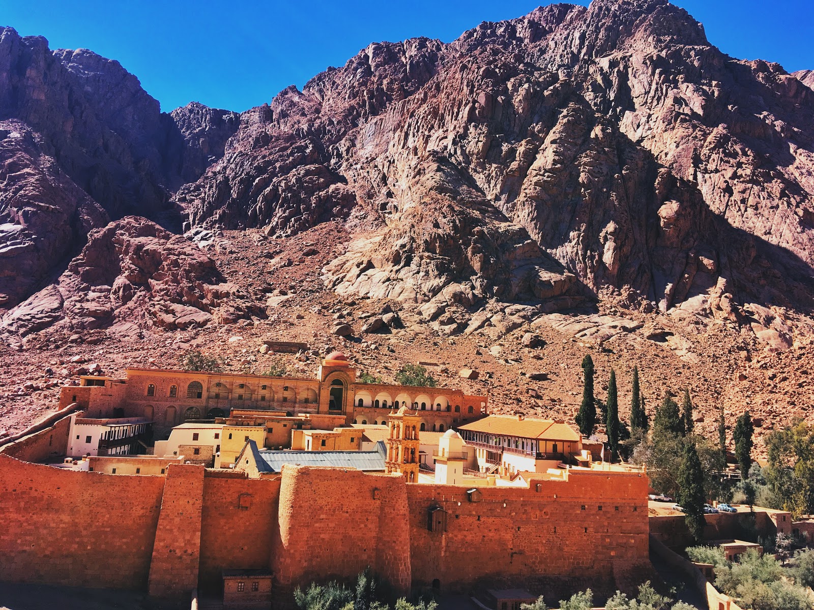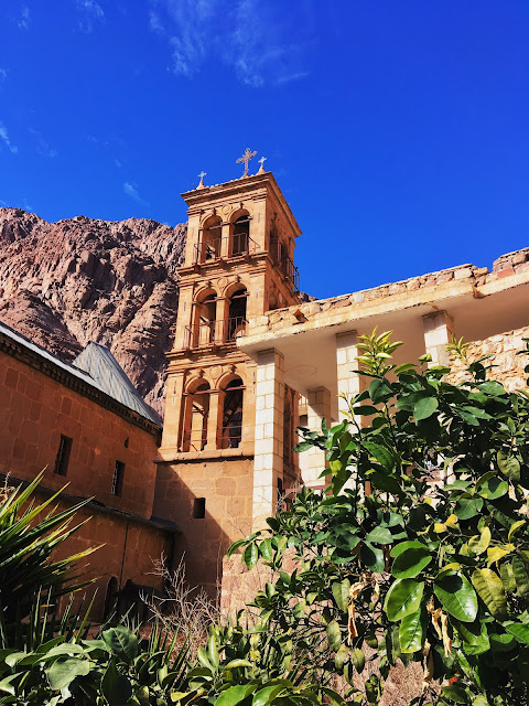 Po uzupełnieniu kalorii na śniadaniu zwiedzamy klasztor. Znajduje się tu biblioteka z bezcennymi zbiorami starych biblijnych manuskryptów, znanych jako kodeks synajski. Oprócz tego jest tutaj krzew rzekomo uważany za ten, w którym Bóg pokazał się Mojżeszowi. W podziemiach przechowywane są czaszki zmarłych mnichów. Takie atrakcje w klasztorze.