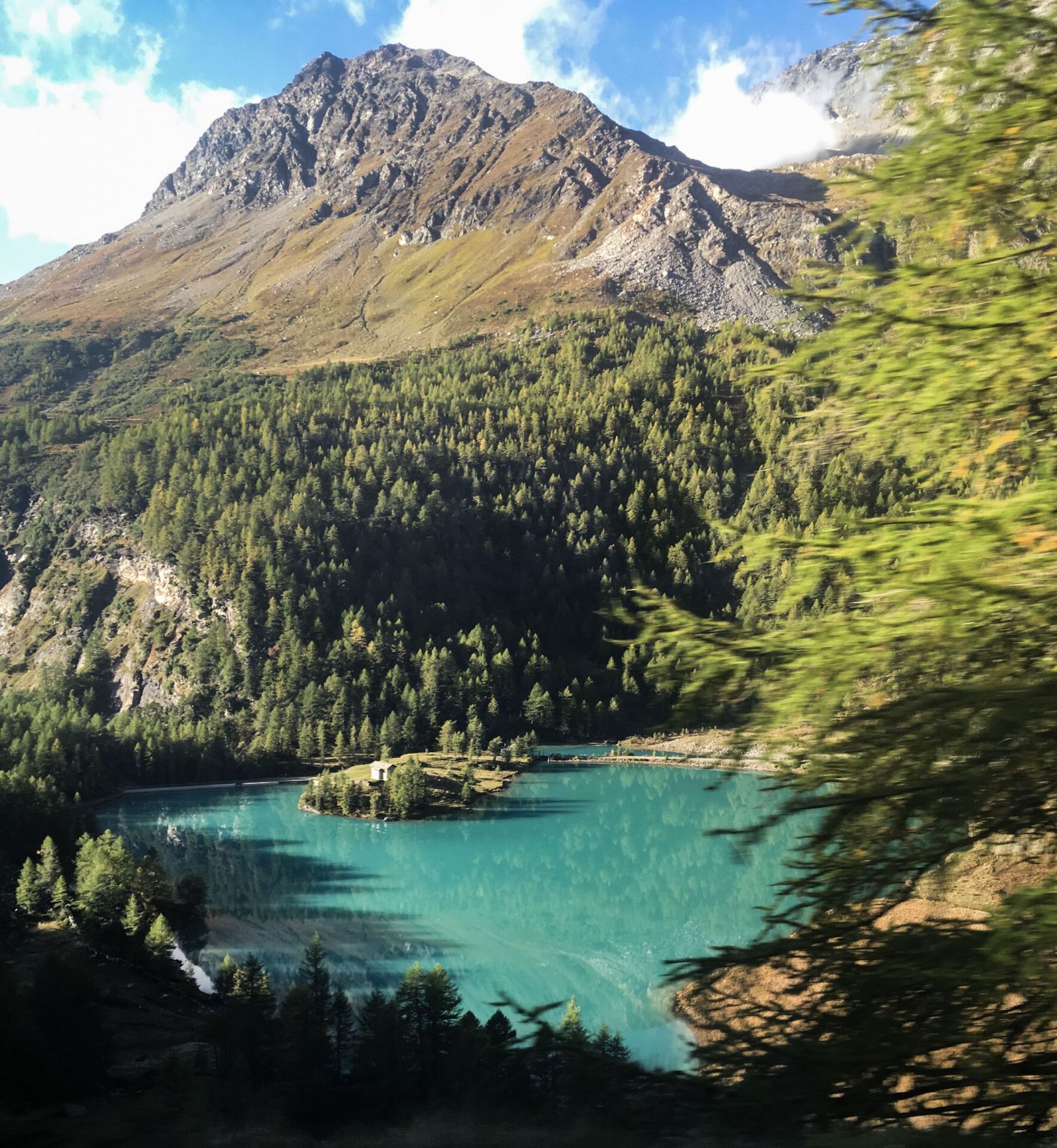 Ponieważ pociąg Bernina Express startuje dopiero o 10 rano, wybrałam zwykły pociąg Regio. Jedzie tą samą trasą, pokonując Alpy w poprzek. Tory wspinają się na szczyty gór, pociąg przejeżdża przez akwedukty i tunele, by osiągnąć 2253 m n.p.m na stacji Ospizio Bernina.