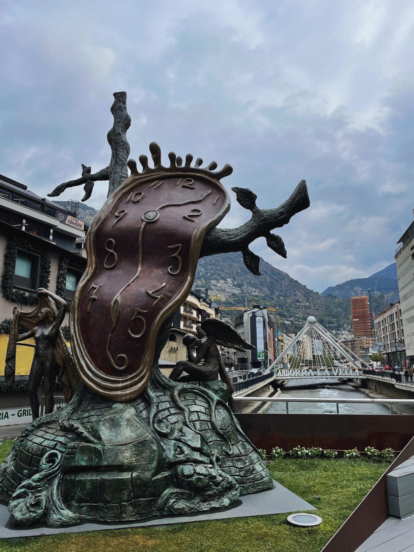 Rzeźba „Noblesa del temps” Salvadora Dali oraz most z napisem Andorra – idealne miejsce do zdjęć