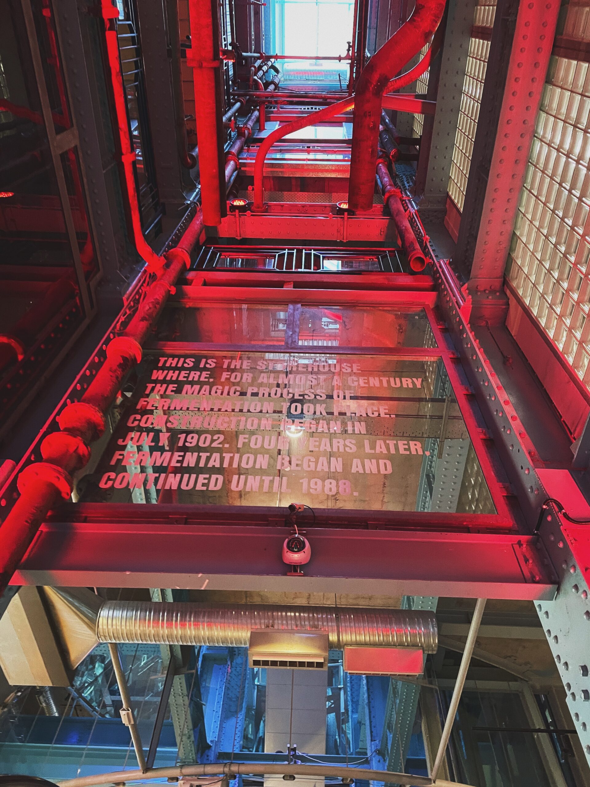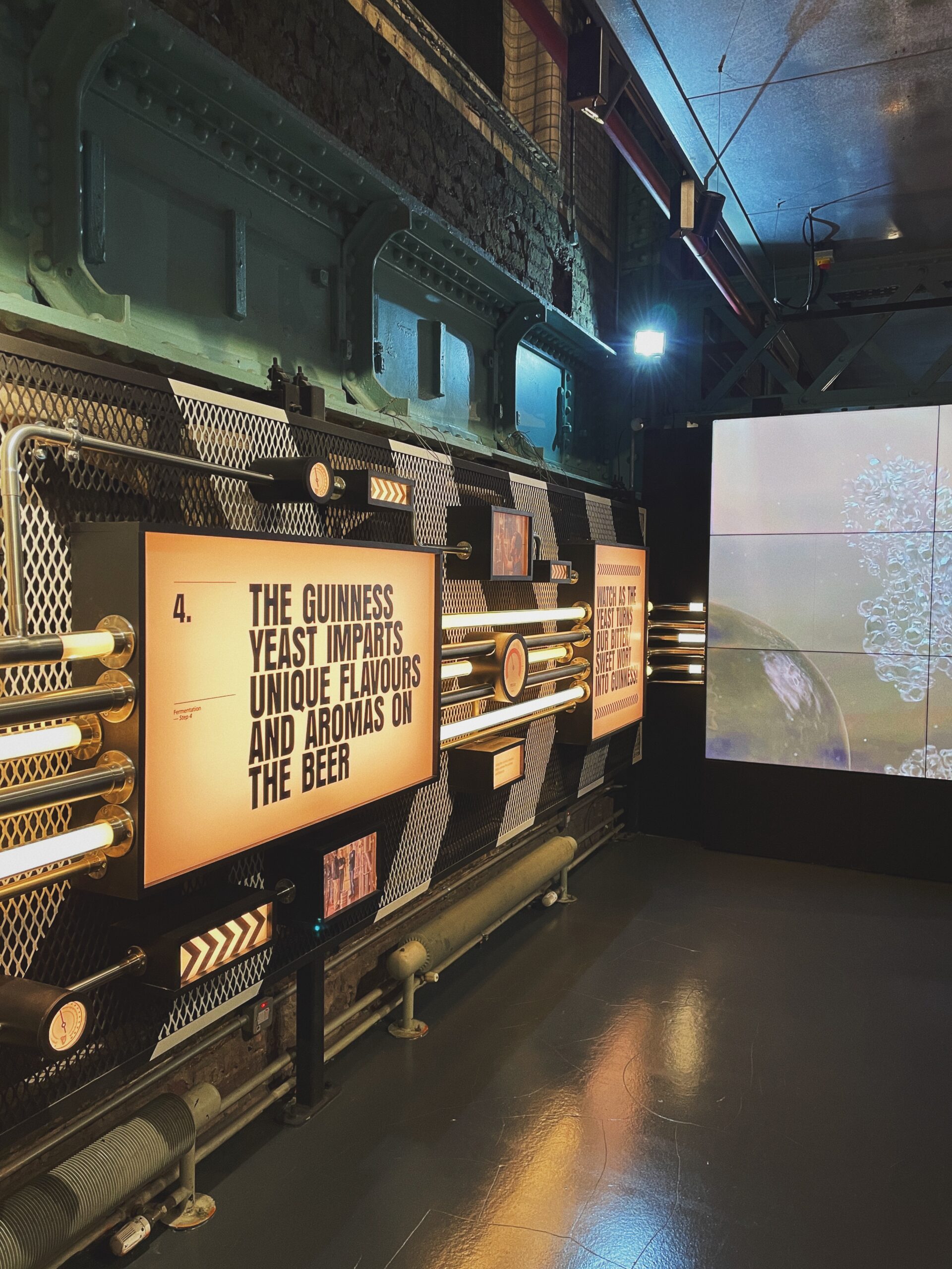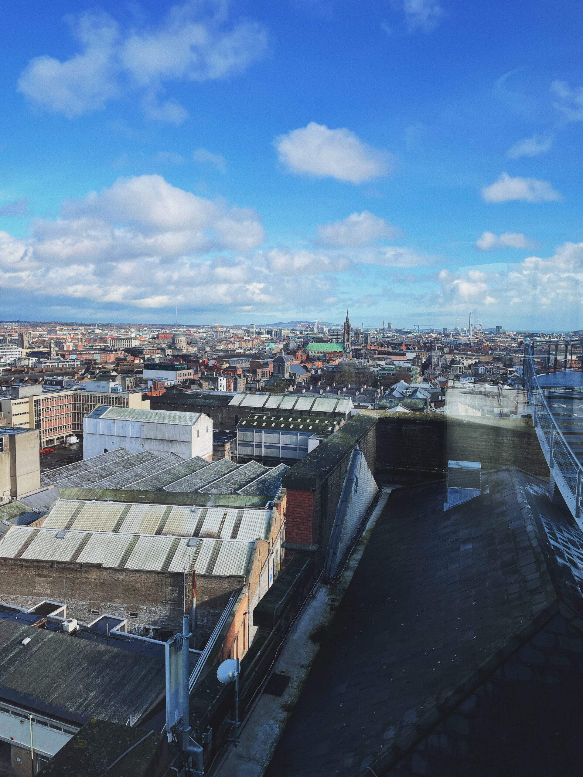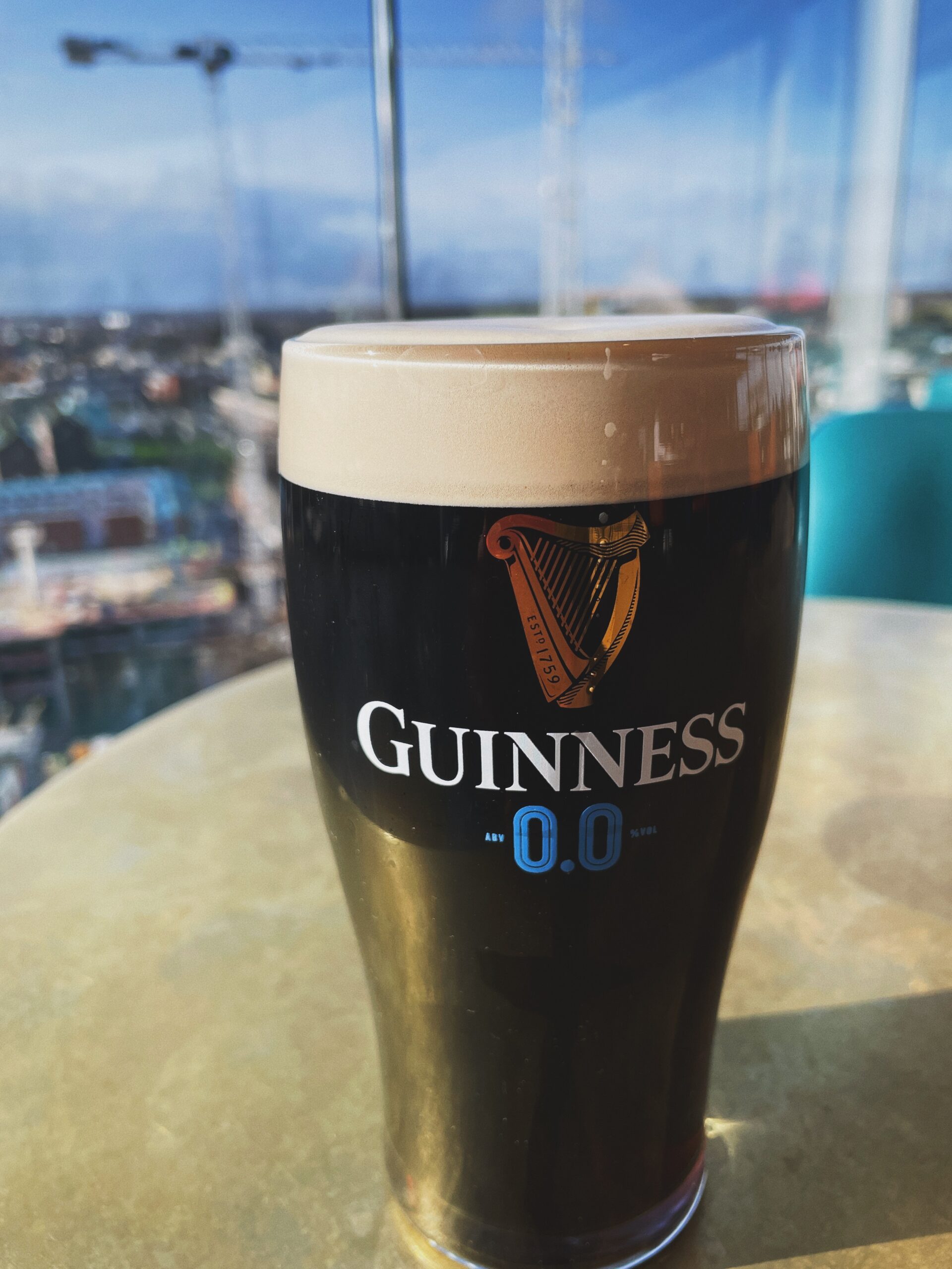 Po drodze są też stanowiska degustacyjne, a na samym wierzchołku dochodzimy do przeszklonego obiektu z pubem, gdzie można dostać pintę Guinnessa w ramach biletu. Jest to też jeden z najlepszych punktów widokowych na Dublin.