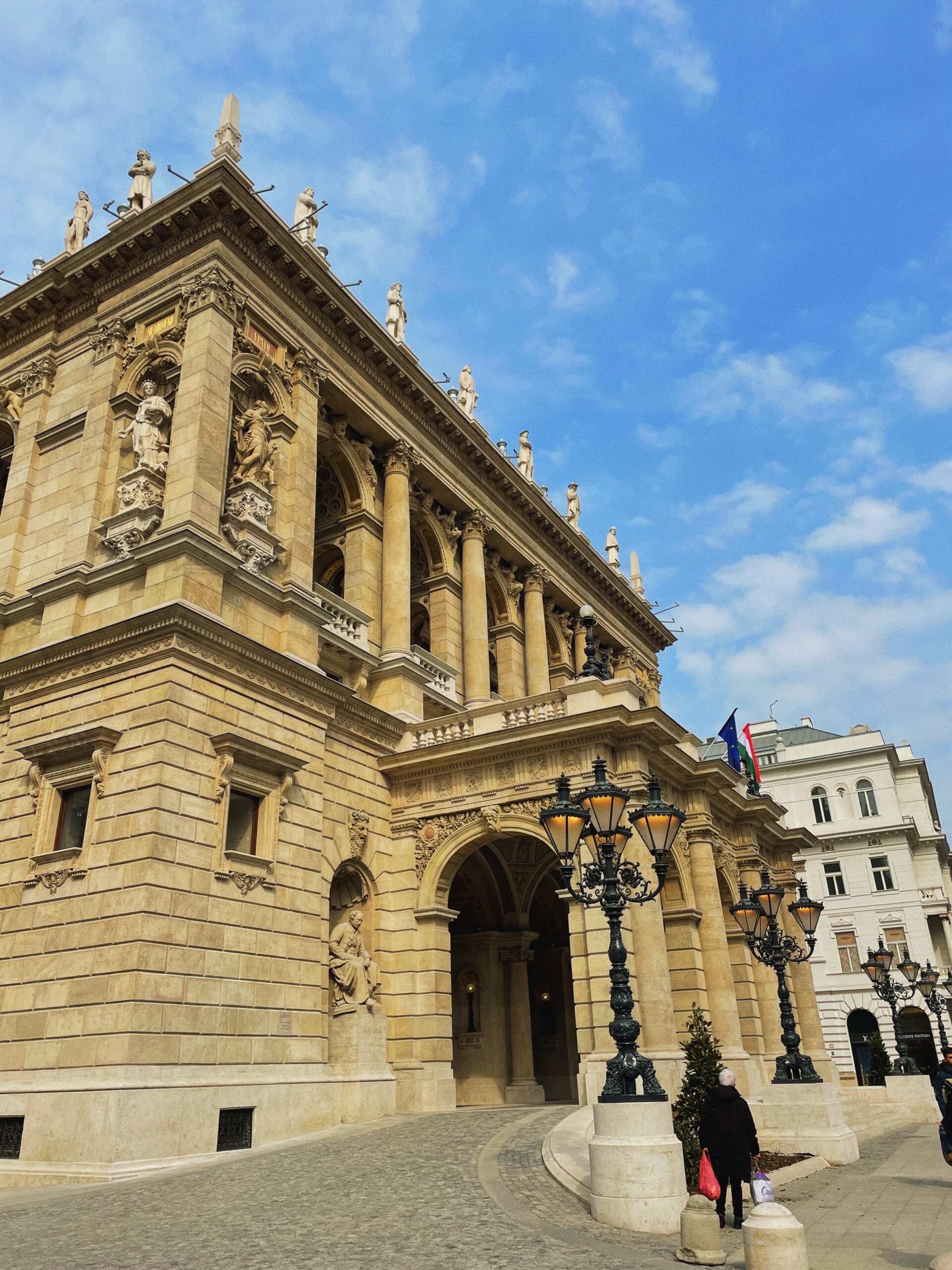Z dzielnicy żydowskiej wychodzimy prosto na Andrássy ut, czyli elegancką arterię Budapesztu, ciągnąca się od Placu Bohaterów do bazyliki św. Stefana. Poniżej Opera Narodowa z pomnikiem Liszta przed wejściem i dwoma sfinksami, eleganckie sklepy i na koniec bazylika z widokiem na zamek królewski w prześwicie.