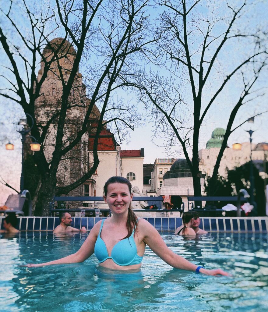 Na odpoczynek po długim dniu chodzenia wybrałyśmy pobyt w spa. Będąc w Budapeszcie nawet w zimie nie można ominąć kąpieli na świeżym powietrzu. Umożliwiają to liczne baseny termalne i łaźnie, istniejące już od czasie rzymskich i tureckich. Łaźnie Gellerta, które odwiedziłyśmy, to ekskluzywny budynek w stylu secesyjnym z kilkunastoma basenami wewnątrz i na zewnątrz, saunami i kabinami parowymi. Wody termalne pozwalają się kąpać w basenie na zewnątrz nawet w marcu.