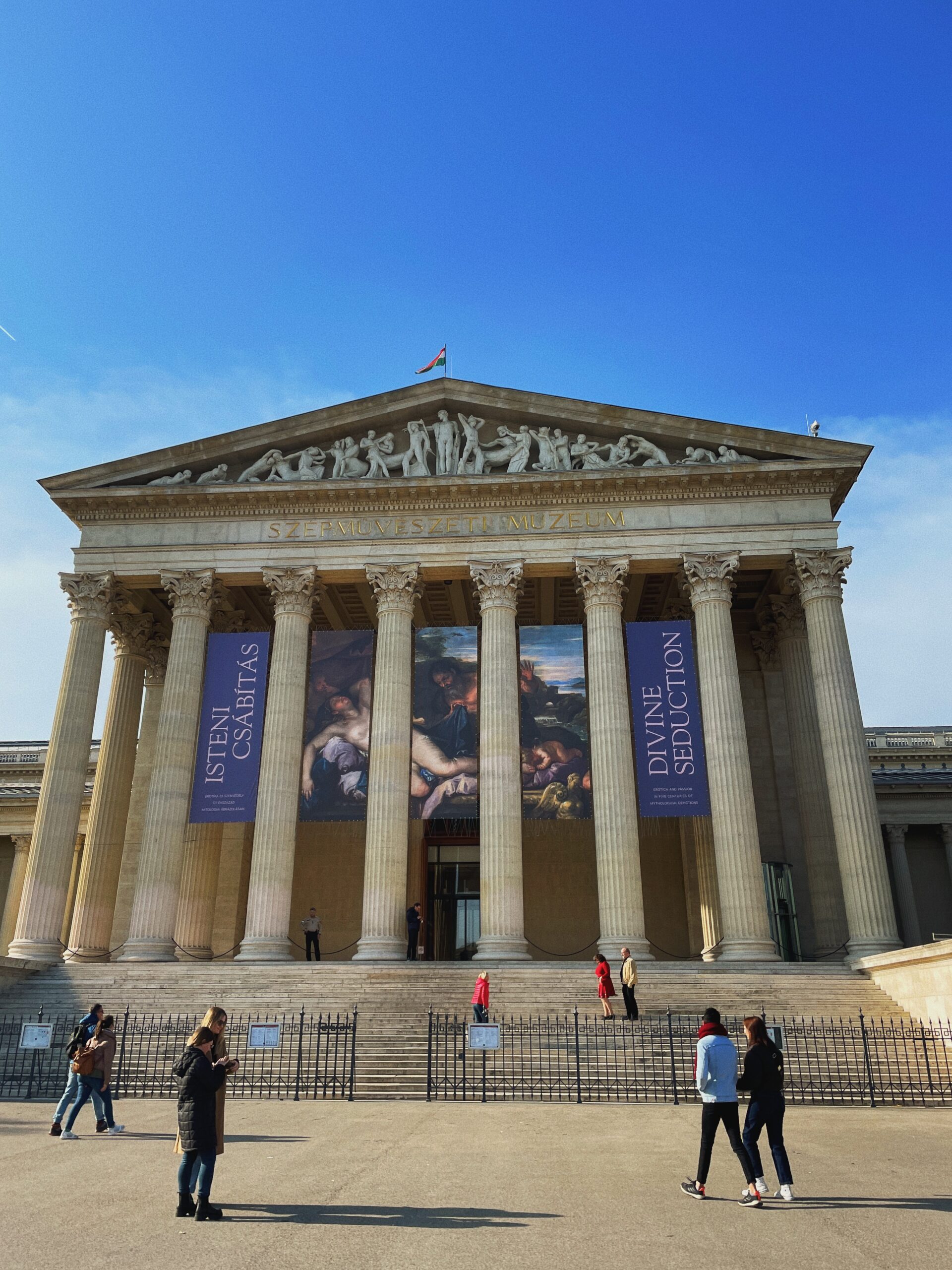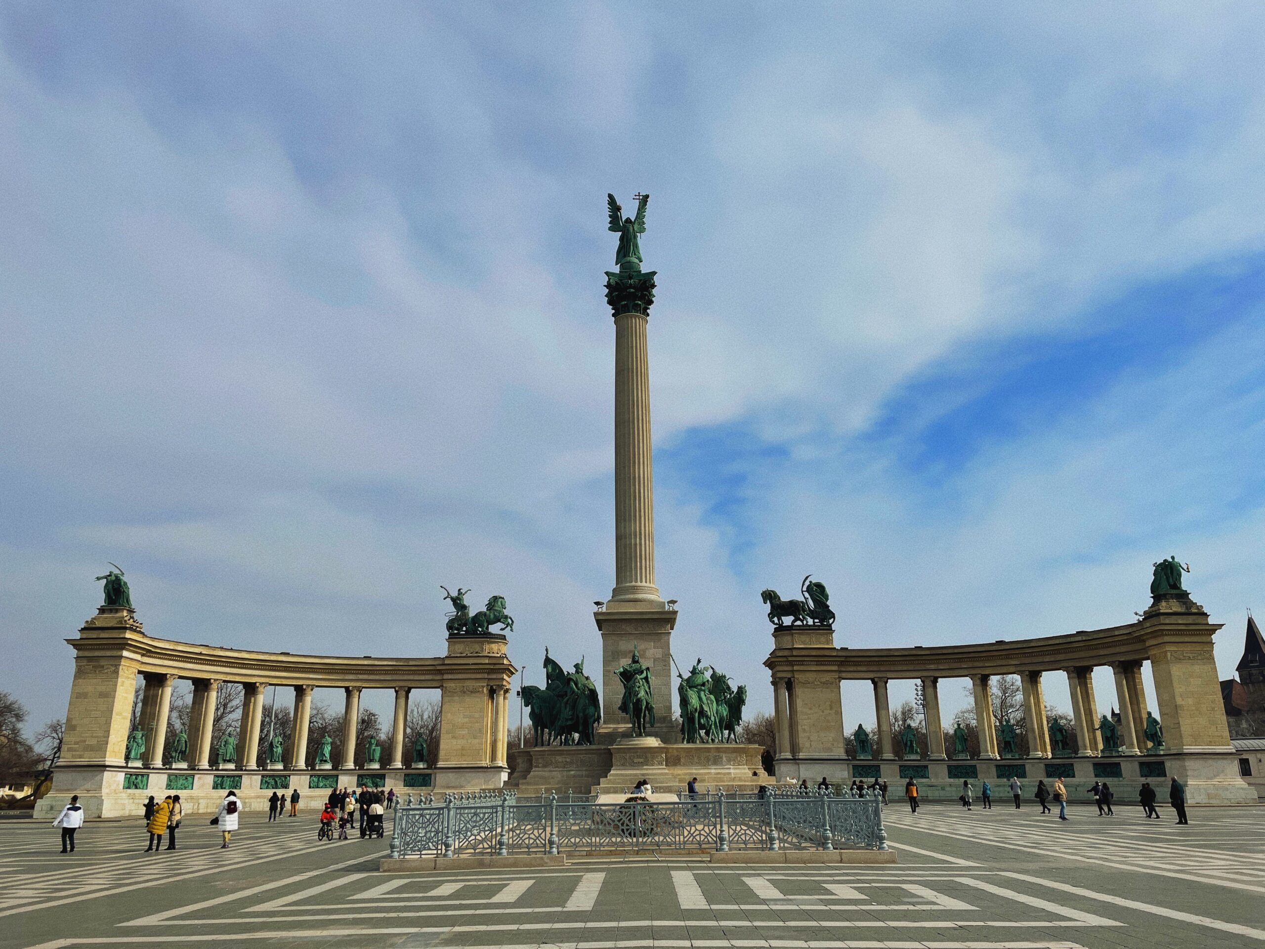 Wysiadamy z metra na przystanku Hősök tere, czyli Plac Bohaterów. Na potężnej kolumnie na środku placu zobaczymy postać archanioła Gabriela, otoczona półkolem rzeźb z przywódcami Węgier. Znajduje się tutaj pomnik nieznanego żołnierza, czyli poległych w I wojnie światowej. Po obu stronach placu znajdują się muzea: Muzeum Sztuk Pięknych i Pałacu Sztuki.