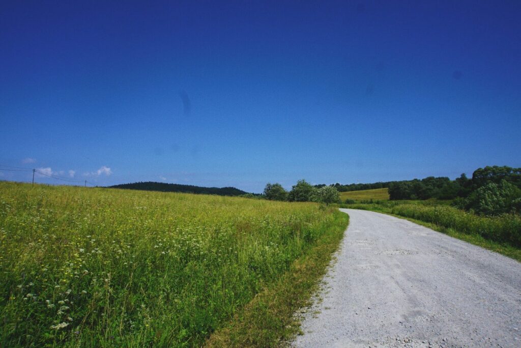 Jazda w kierunku rozwidlenia szlaku granicznego z żółtym (słowackim) była czystym downhillem, przerywanym omijaniem zwalonych pni. Szybko też wskoczyłam na szutrową trasę rowerową w pobliżu Ol’sinkov, a stamtąd dalej na drogę prowadzącą do Medzilaborców. Z tego odcinka nie miałam wielu zdjęć, bo albo wypychałam rower pod górę, albo z niej zjeżdżałam, pędząc jak wiatr.